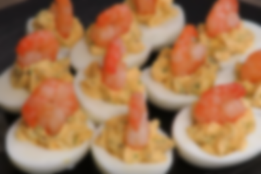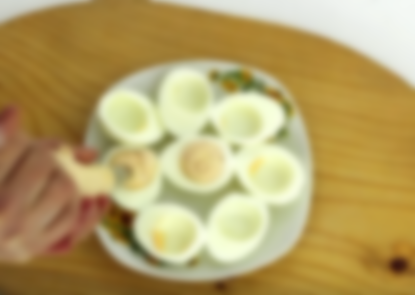 9. Начините получившимся «фаршем» белки. Выложите их на красивую плоскую посуду.