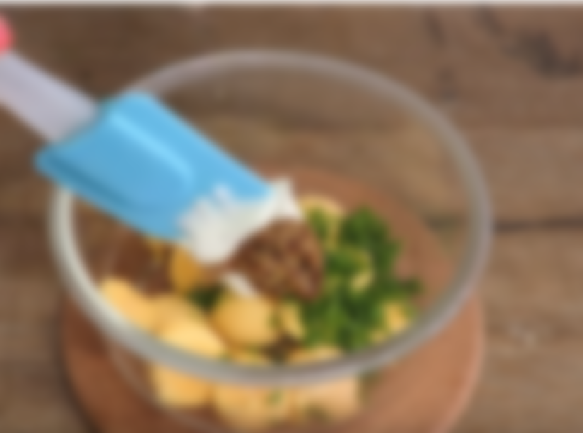 Мелко нарезаем зеленый лук, часть добавляем в начинку, часть оставляем для подачи. Солим и перчим начинку по вкусу. Добавляем горчицу. Если получилось суховато, добавляем немного жидкости из банки.