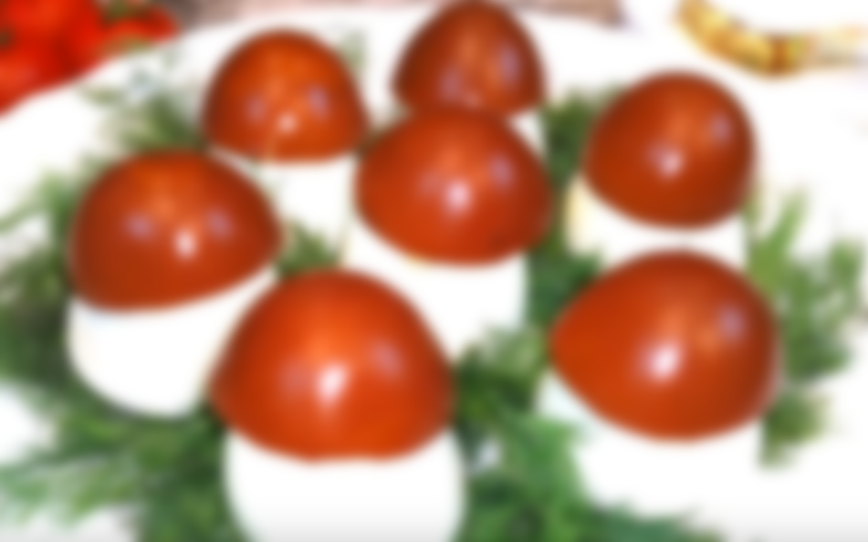 - Фаршированные яйца в виде мухоморов наверняка видели все! Однако, готовить их спешат не многие: надо немного повозиться. Чтобы нафаршировать яйца, срезайте верхушку, аккуратно доставайте желток, заполняйте начинкой. Сверху яйцо накрывайте половинкой небольшого помидора, очищенного от мякоти (семечек), с помощью майонеза ставьте на поверхности «гриба» круглые белые точки. Выкладывая на тарелку, не пожалейте зелени – мухоморы будут отлично смотреться на лужайке с сочной травой.
