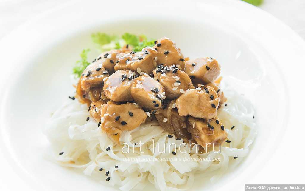 Бархатная курица по-китайски готова! При подаче можно посыпать немного кунжутом. Например, я использовал как чёрный, так и белый кунжут. В качестве гарнира использовать можно рис, макаронные изделия. Я подал с рисовой лапшой. Чтобы совсем по-китайски получилось. Приятного аппетита!