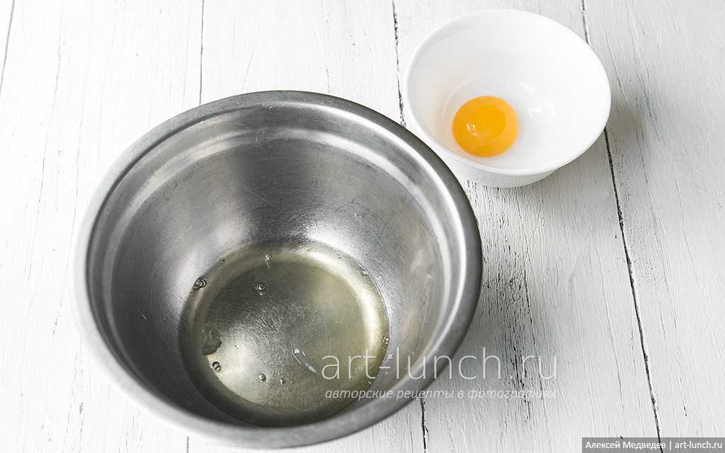 Отделяем желток от белка. Желток нам не понадобится, убираем его в холодильник. Белок слегка взбиваем венчиком или вилкой для удаления сгустков и получения однородного белка.