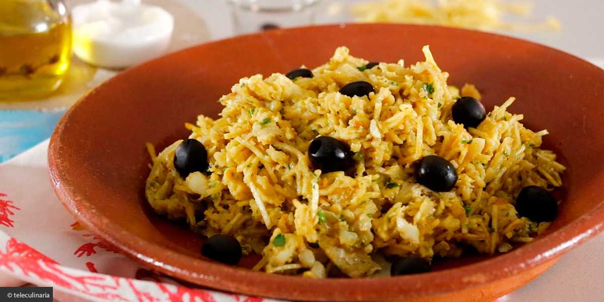 Блюдо для начинающих. Подается во многих забегаловках и очень популярно, так как его просто готовить. Кусочки рыбы с картофельными чипсами соломкой тушат на сковороде, с луком и яйцом. После добавляют маслины и зелень.