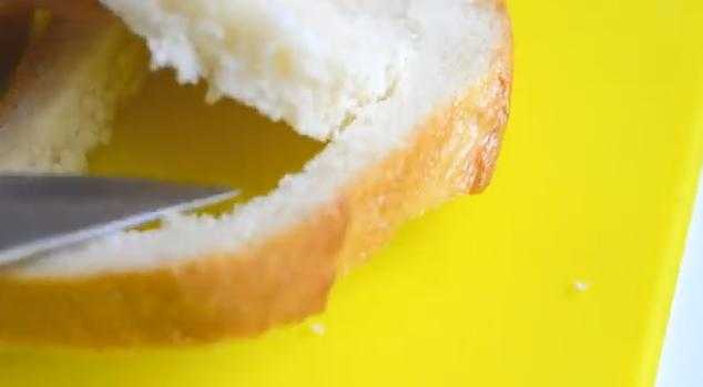 Я хочу показать вам одну хитрость, вы можете из четырех кусочков батона сделать не четыре штуки гренок, а целых восемь, интересно каким образом? Все элементарно просто на самом то деле. Смотрите и повторяйте эти пошаговые шаги за мной.