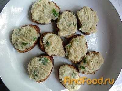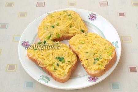 4. Белый хлеб или батон порезать на ломти. На каждый — щедро выкладывать подготовленную картофельную массу, немного придавливая ее.