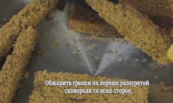 - Разогреть растительное масло на сковороде. Обжарить гренки с двух сторон до румяной корочки.