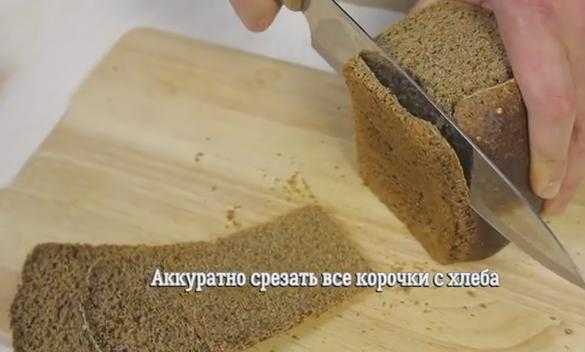 1. Необходимо взять нужное количество батона, желательно белого. Аккуратно при помощи острого ножа по периметру удалите сердцевинку, оставляя только бортики.