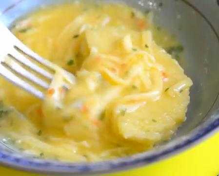 - Картофель и морковь натереть на мелкой терке. Добавить соль,перец ,яйцо и перемешать.