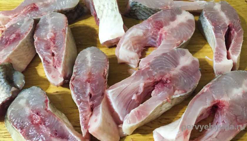 - Сначала выпотрошенную и промытую рыбу режут кусками, выкладывают в подходящую тару.