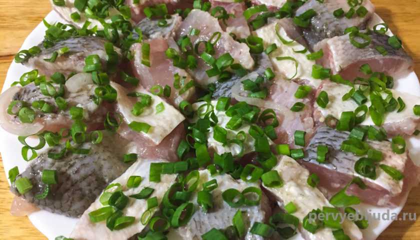 - Далее режут филе кусочками и посыпают полукольцами лука.