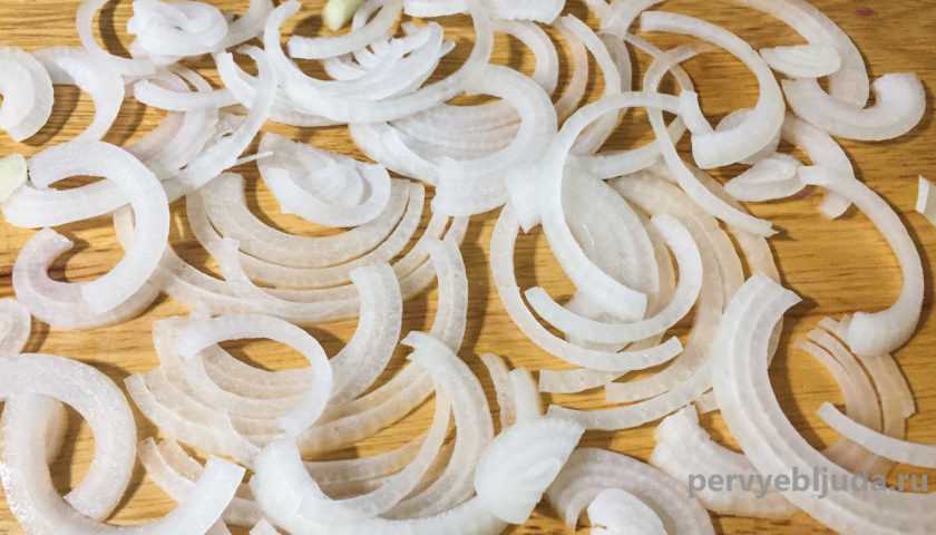 4. Чистим от шелухи лук и нарезаем полукольцами.
