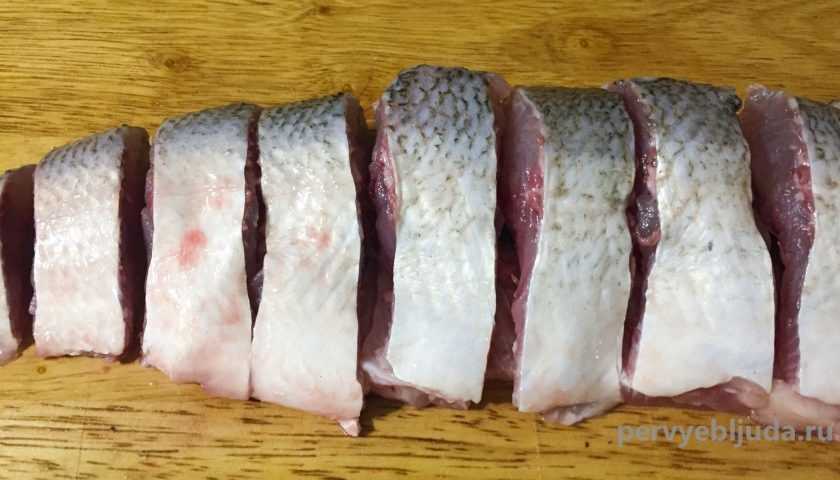 - Далее подготовленную рыбу следует порезать на кусочки, каждый из них обвалять в полученной смеси и уложить в подходящую тару.