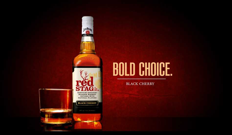 - Rеd Stag Black Cherry — виски со вкусом вишни стандартной 4-х летней выдержки и крепостью в 40%. Горячительное Red Stag появилось благодаря совмещению Jim Beam Honey Tea и Spiced с добавлением вишни. Этот бурбон имеет насыщенный фруктовый аромат и вкус с оттенками кукурузы, дуба и спелой вишни.