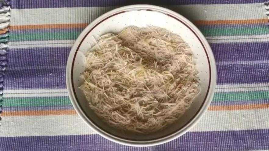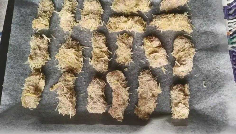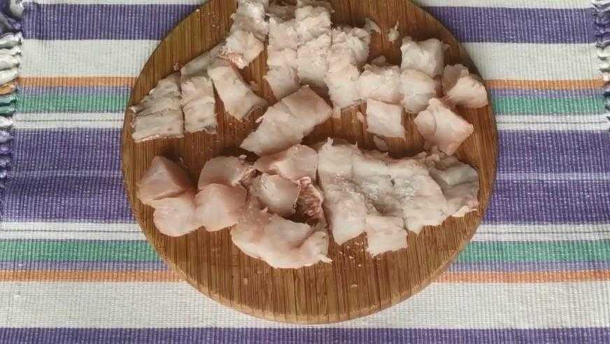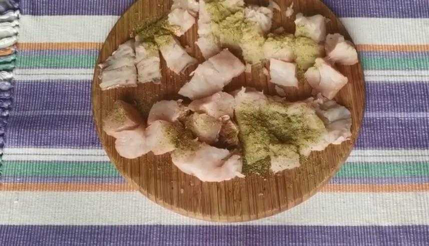 - Разморозить филе при комнатной температуре, без использования горячей воды и микроволновки. Натереть солью. Нарезать небольшими кусочками.