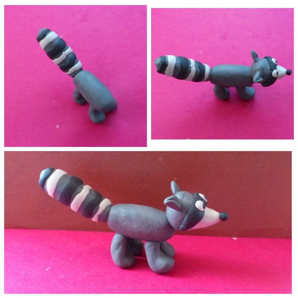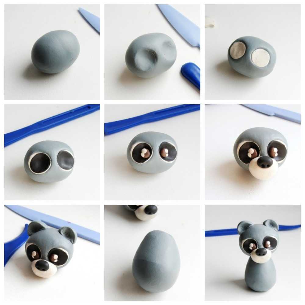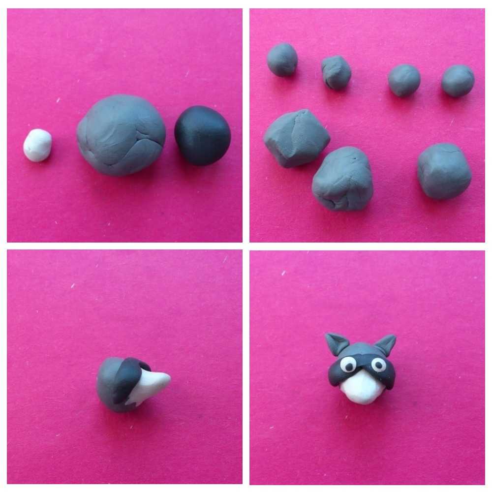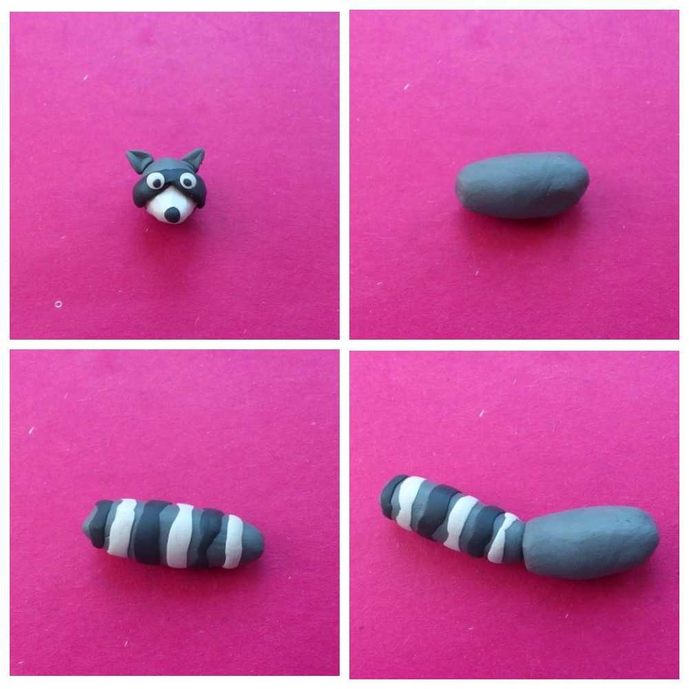 Для начала слепим голову енота, а после присоединим ее к туловищу, которое дополним лапками и хвостиком. Скатываем из готовой серой массы равномерный овал.
