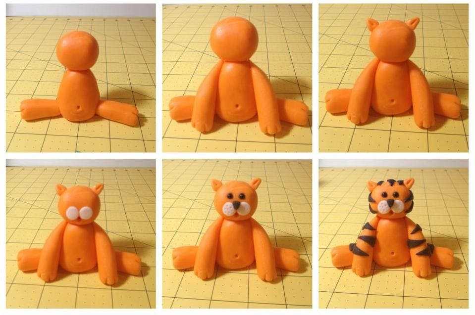 Всем знакомый персонаж может выполняться самыми различными методами. В одном из них следует вытянутый раскатанный кусочек в каждой стороны разделить на две части — это будут лапки. Потом надо прикрепить колбаску в роли хвоста и колобок с ушками, глазами, носом, ртом и усами. Котик готов.