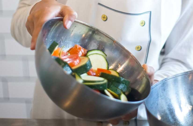 1. Грибы нужно мариновать отдельно от других овощей, поэтому нарезанные кольцами кабачки складываем в одну миску, а грибы в другую.
