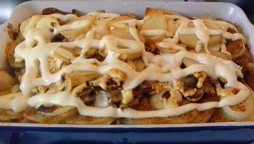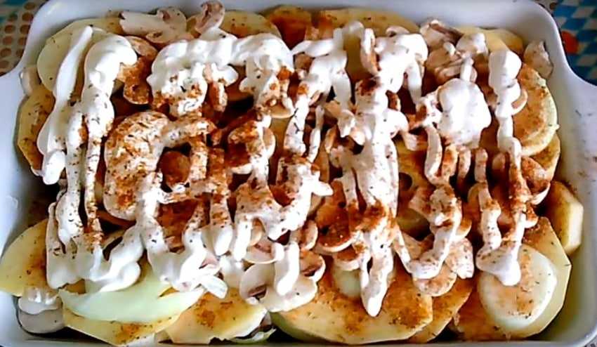 Вкусная картошка под майонезом с луком и грибами в духовке