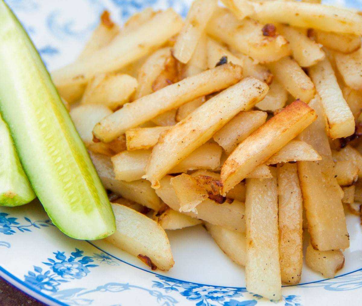 Вкуснее всего жареная картошка получается на чугунной сковородке. Секрет заключается в высокой теплопроводности этого металла. Толстое чугунное днище, разогретое над конфоркой, быстро передаёт тепло стенкам и крышке. Содержимое во всём объёме нагревается равномерно, чугун обеспечивает оптимальный температурный режим. Такая сковорода подобна духовке и скороварке одновременно. А высокие борта позволяю использовать её и как фритюрницу. В кипящим масле за пару минут готовится картошка фри.