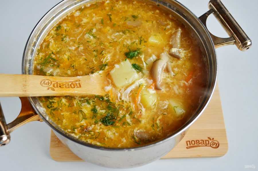 Нарезанные грибы отварите. В грибной бульон добавьте воды (чтобы всего было около 1 л жидкости), доведите до кипения и бросайте в него нарезанный кубиками картофель. В это же время на сковороде тушите минут 5 мелко нашинкованный лук, нарезанный соломкой перец и тертую морковь. Затем добавьте к ним томаты и аджику, и тушите еще минут 5. Когда зажарка будет готова, добавьте в бульон рис и грибы. Варите 10 минут, а после вливайте зажарку, взбитые яйца и специи. Подавайте на стол, посыпав мелко порубленной зеленью.
