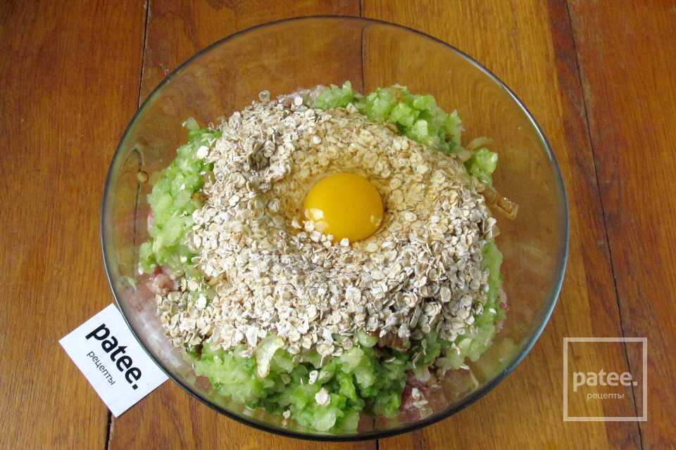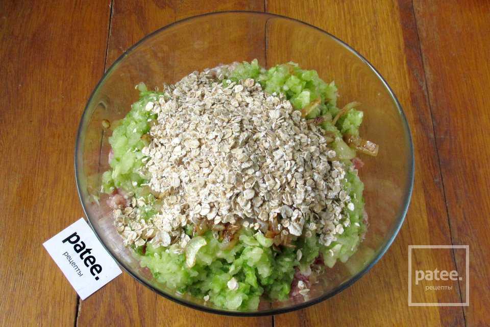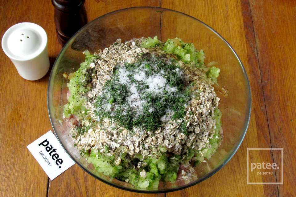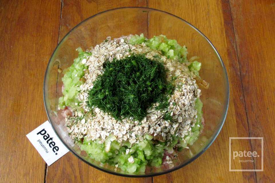 - Возвращаемся к овсяной смеси. Пропитанные молоком, разбухшие крошки перекладываем к фаршу. Солим, перчим.