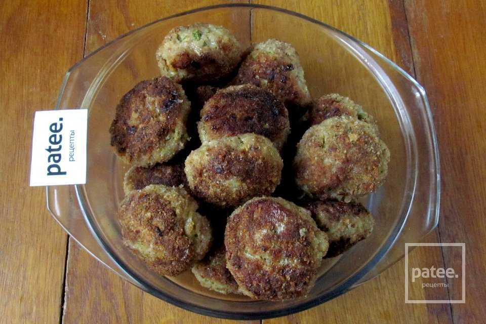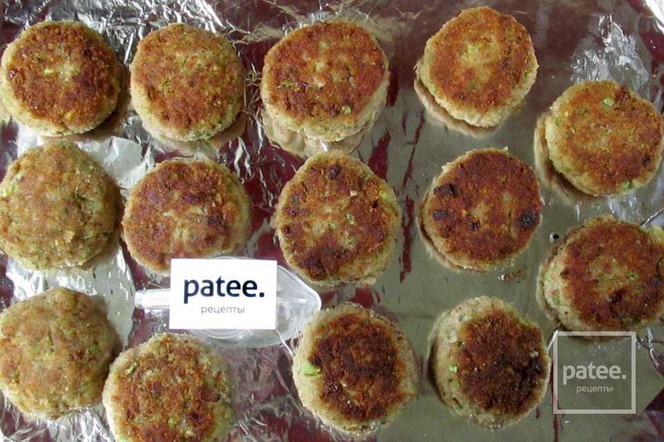- Чуть влажными руками (смоченными водой) формируем круглые или овальные котлеты и сразу выкладываем на разогретую, смазанную растительным маслом сковороду. Получится примерно 10 штук заготовок (количество может отличаться, зависит от выбранного размера). Жарим на среднем огне около 5 минут — до подрумянивания низа.