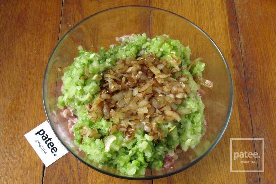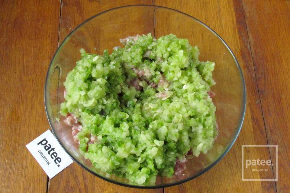 Лук нарезать как можно мельче или порубить при помощи блендера до мелких кусочков. Добавить в общую емкость (если выделился сок, то и его тоже).