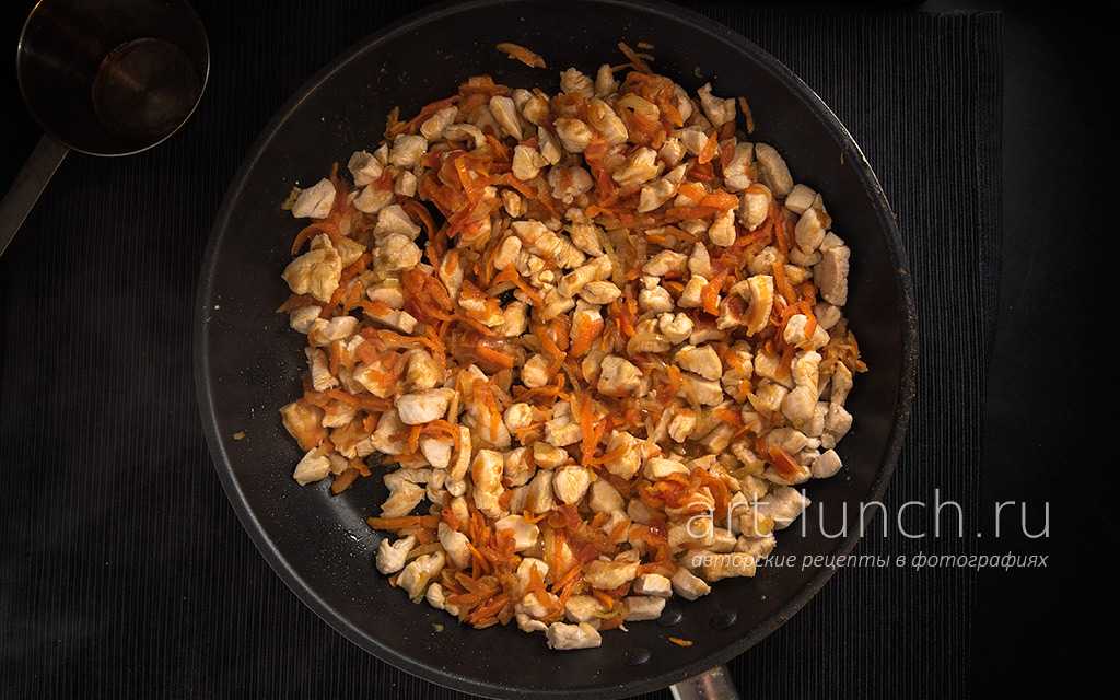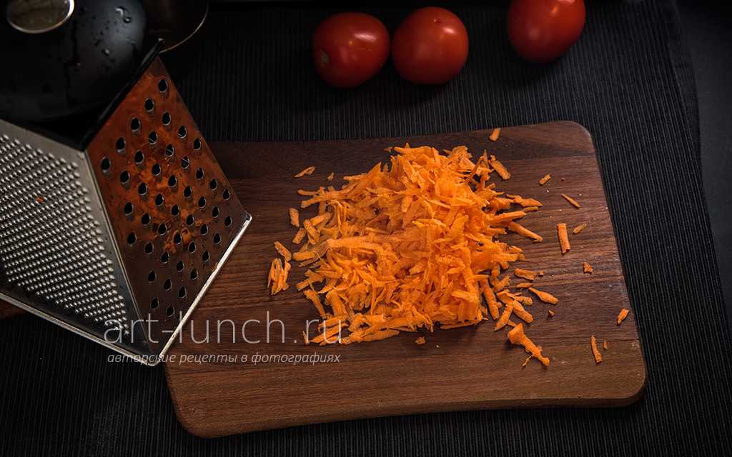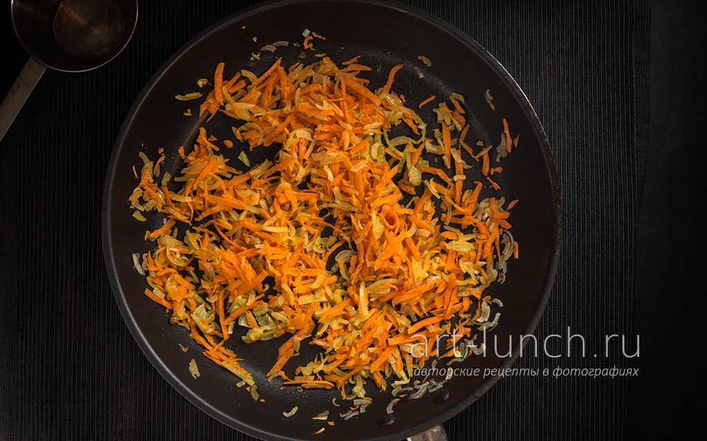 Как только он станет прозрачным, добавляем морковь, натертую на терке, обжариваем все вместе минут пять.
