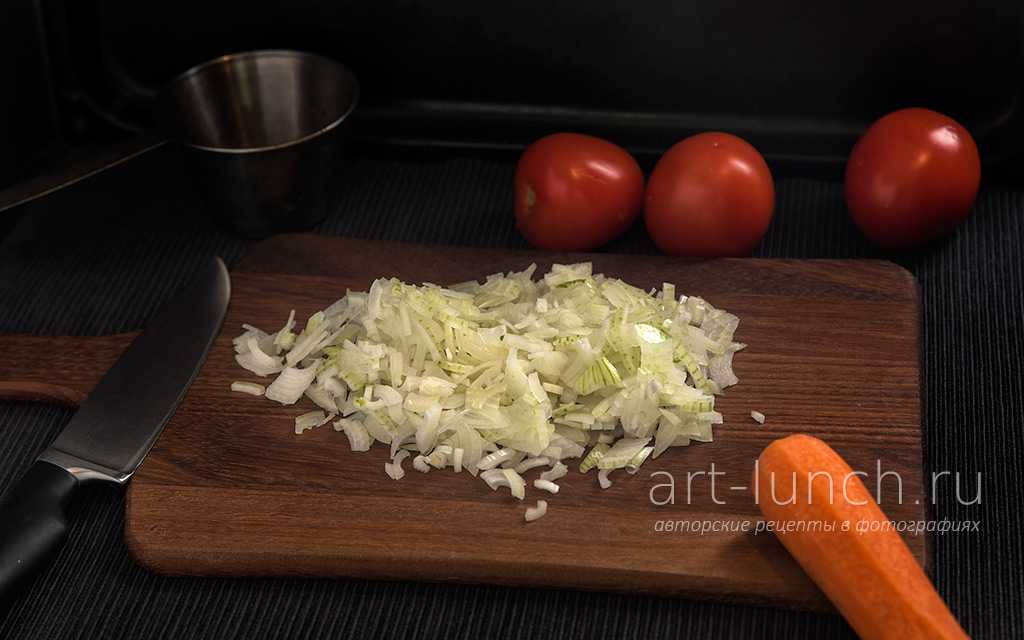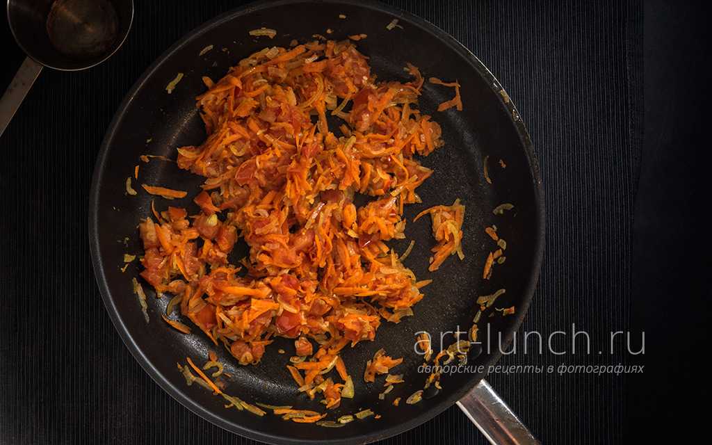 Добавляем помидоры в сковороду к луку и моркови, увеличиваем мощность плиты до максимума и жарим, постоянно помешивая, 3 минуты. К этому времени кусочки помидоров уже должны потерять своё лицо свою форму и начать расползаться. Если этого не произошло, то продолжайте жарить ещё минуту. Освобождаем сковороду — выкладываем обжаренные овощи в отдельную ёмкость, они нам понадобятся несколько позднее.