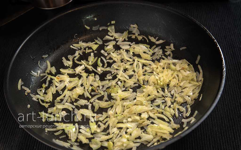 - Лук нарезается мелкими кубиками и обжаривается на масле до мягкости.
