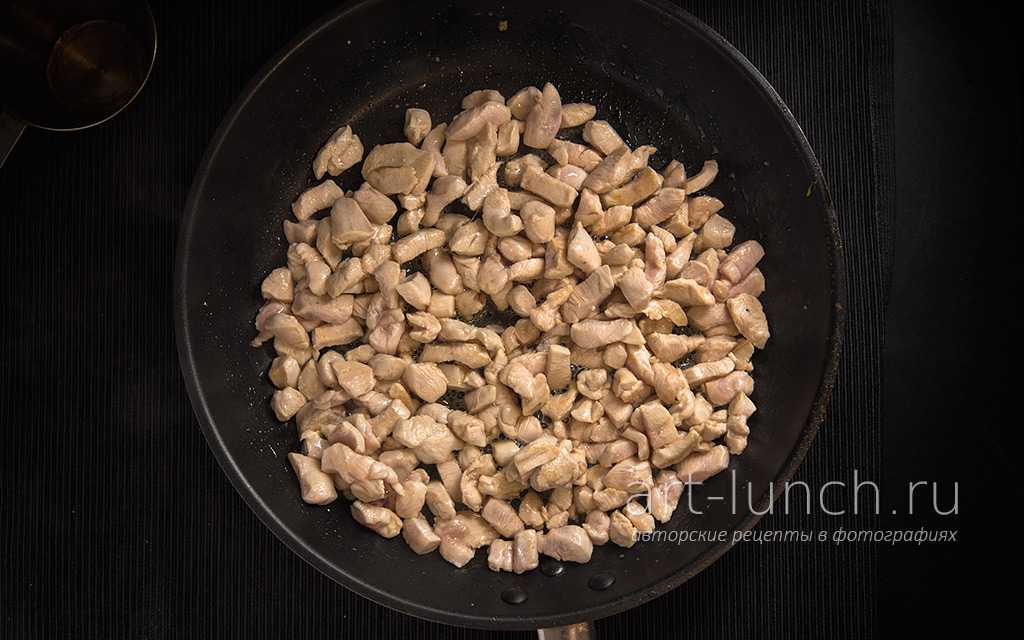 Нарезаем куриное филе на кусочки небольшого размера, хорошенько разогреваем сковороду с подсолнечным маслом и обжариваем куриное мясо на максимальной мощности 5 минут, помешивая каждые 30 секунд. Во время жарки филе добавляем в сковороду соль в количестве 1/2 чайной ложки.