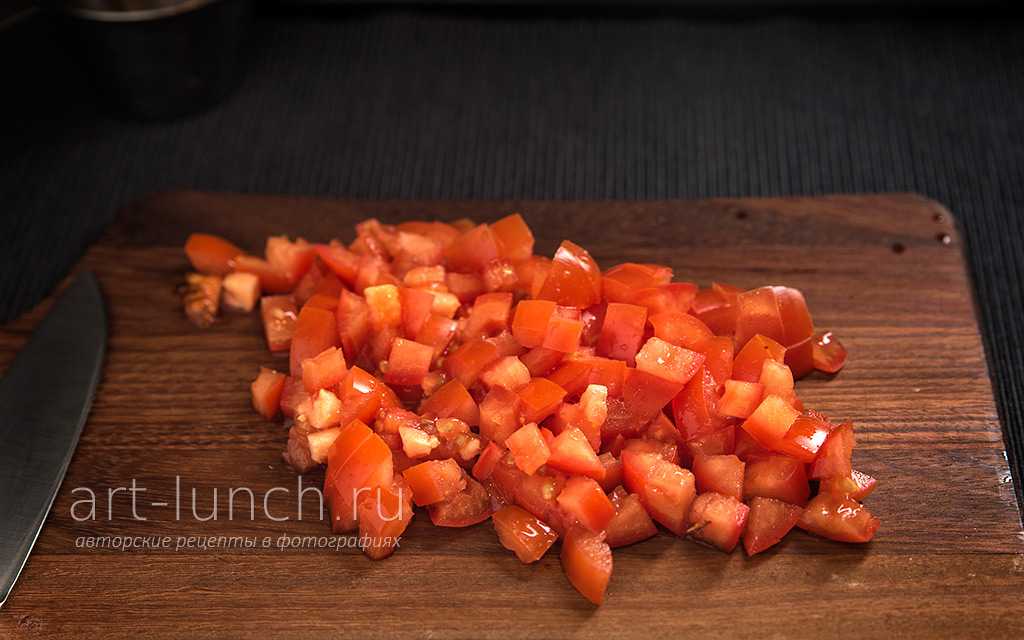 Нарезаем помидоры на кубики небольших размеров.