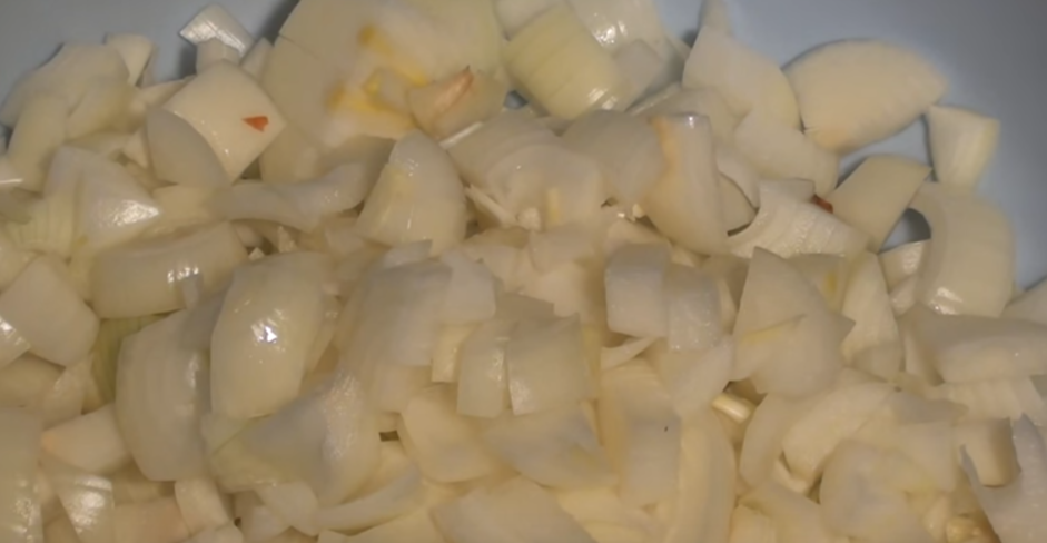 Лук нарезаем полукольцами, но, если есть время, то лучше его пюрировать или натереть в кашицу, чтобы он дал больше сока.