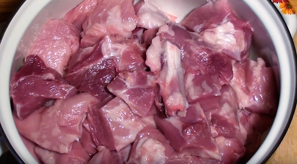 - Корейку порубить на куски. Выложить в таз для маринования.