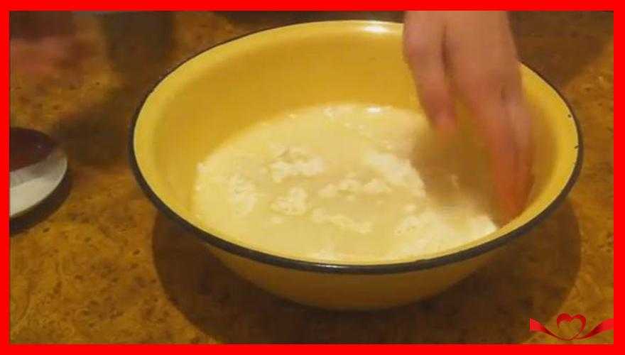 - Насыпьте половину порции муки и начинайте вымешивать до тех пор, пока масса не станет однородной.