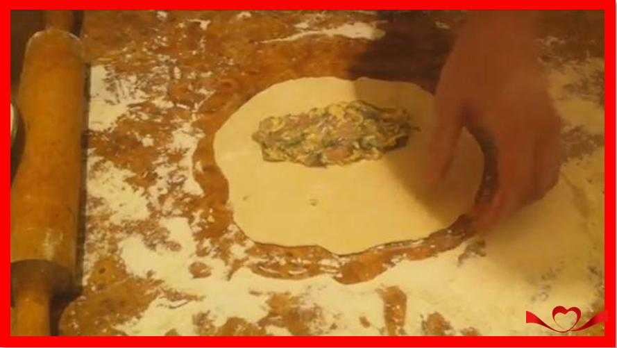 11.На одну сторонку лепешки положите одну с горкой ложки начинки.