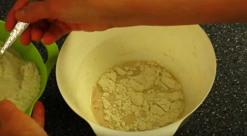 - В миску с молоком всыпаем муку, смешанную с дрожжами, замешиваем тесто.