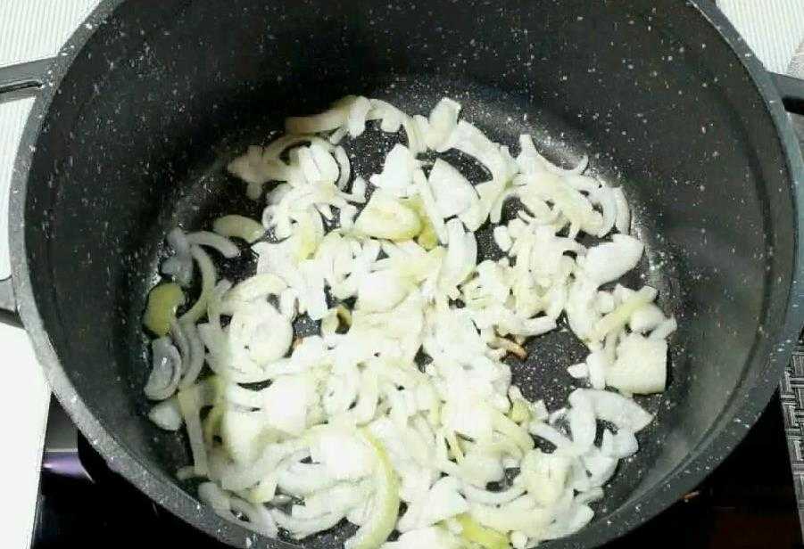 В глубокой сковороде обжарить на растительном масле лук в течение 5 минут.