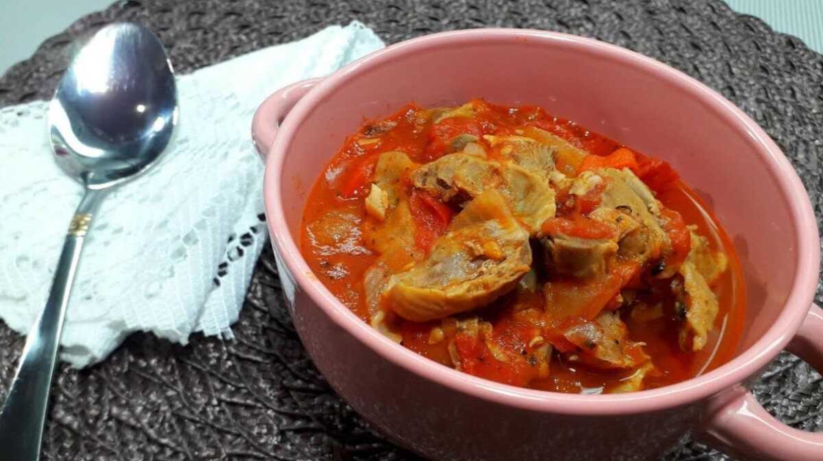 Если сметаны в холодильнике нет, зато имеется банка томатов в собственном соку, то получится оригинальное блюдо. Куриные желудочки тонут в остром томатном соусе с добавлением ломтиков пикантного болгарского перца. Это блюдо не слишком калорийное, но очень вкусное, поэтому его нужно делать сразу в больших количествах.