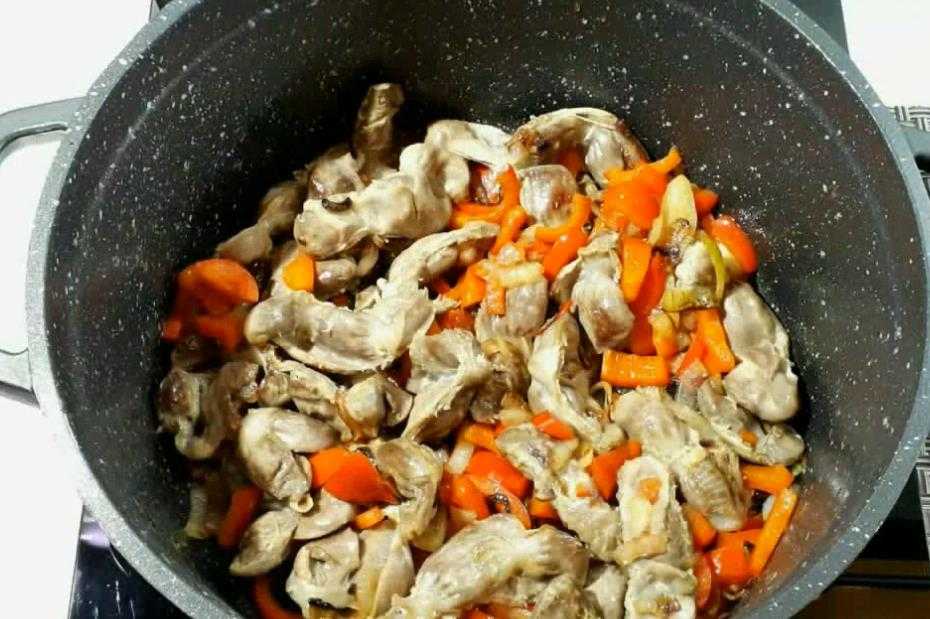 Добавить к луковице желудки, разрезанные на 2-4 части. Через 7 минут смешать с болгарским перцем, протушить до мягкости.