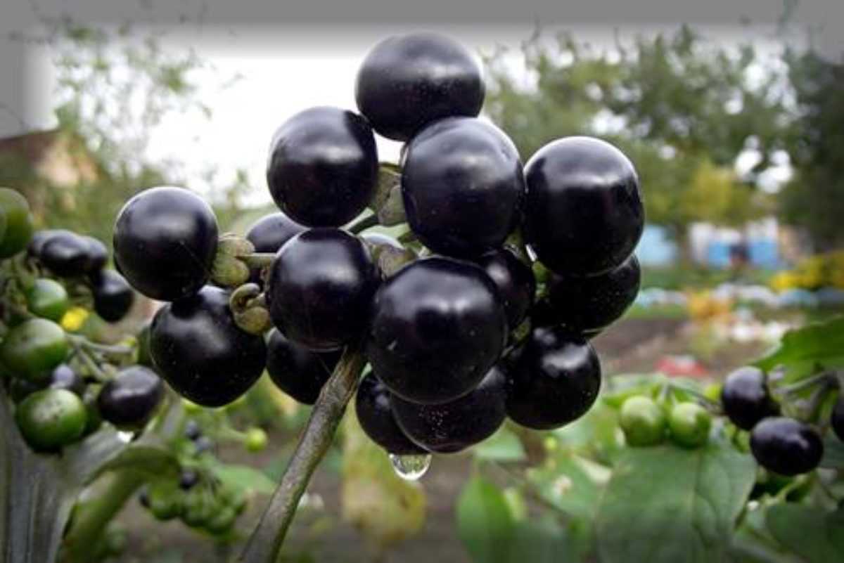 Ближайшая родня санберри – томаты и баклажаны, плодоносит она черными ягодками, которые собраны в гроздья. На одной кисти может располагаться до 10 штук размером с вишню, цвет – как у черной смородины.