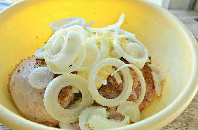 Кефир имеет естественную кислоту, которая хорошо пропитает волокна и смягчит их. Также мы знаем, что любое мясо хорошо поддается воздействию лукового сока, поэтому обязательно его используем.
