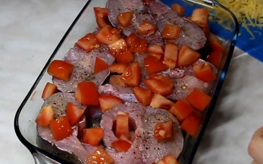 - Засыпьте рыбу луком, сверху положите помидоры, смажьте их оставшимся майонезом.