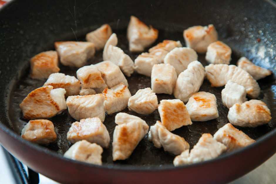 - Тем временем овощи можно почистить, нарезать кубиком среднего размера и обжарить вместе с индейкой на протяжении 10 минут. Затем в сковородку потребуется налить 100 мл воды.