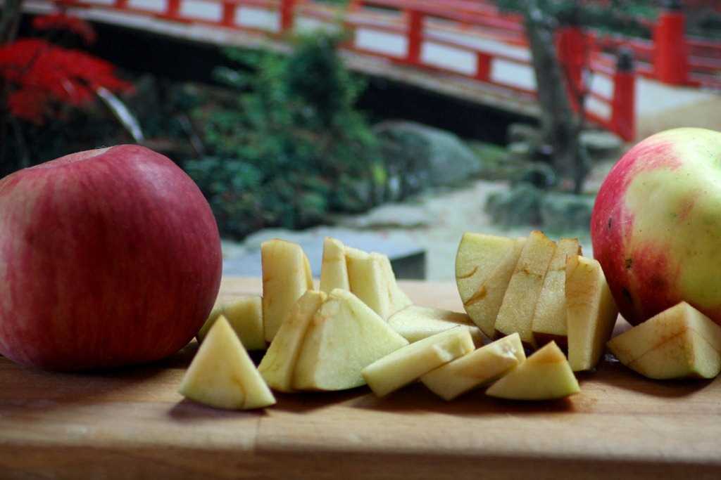 - Яблоки очистить от кожуры, порезать мелкими кубиками. Отправить к тыкве.