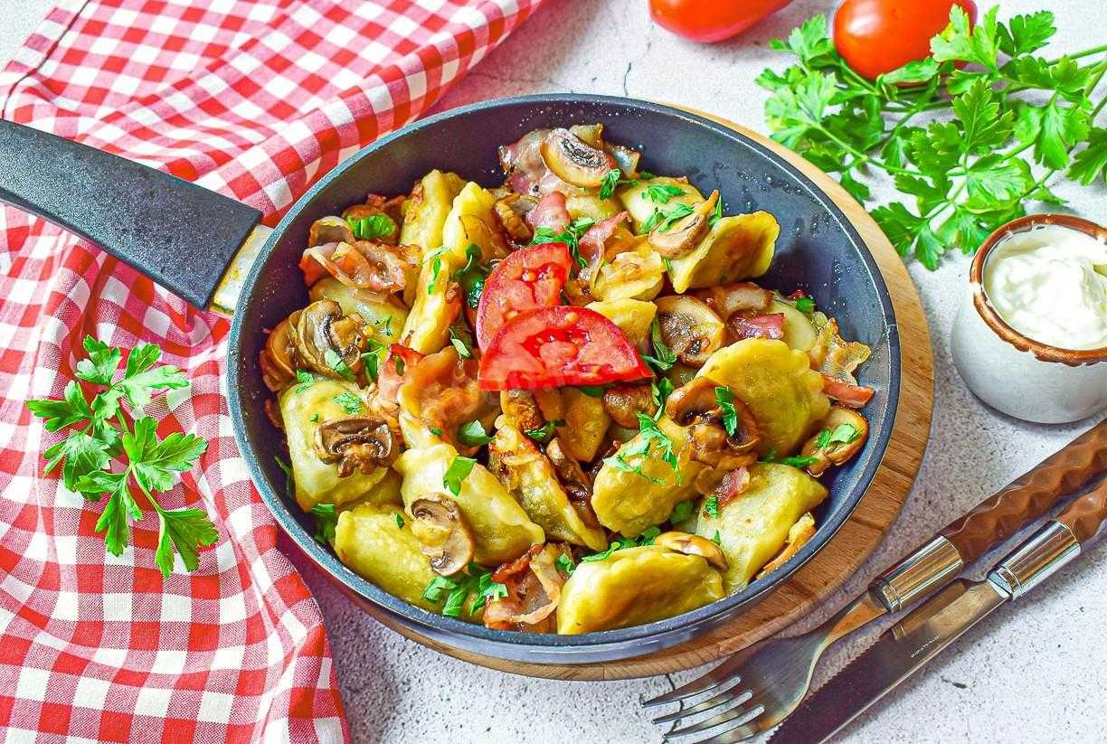Вкусное повседневное блюдо для всей семьи за 20 минут! Жареные вареники с картошкой можно приготовить семье на ужин легко и просто. Вам потребуются сами полуфабрикаты и любые наполнители: лук, бекон, грибы, ветчина, морковь, зелень, помидоры и так далее.
