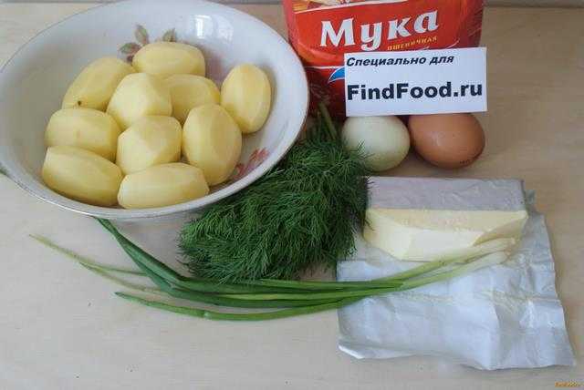 Картофель очистим и сварим до готовности. Отвар сольем, картошку растолчем до состояния пюре, добавляем сливочное масло. Когда картошка немного остынет, добавляем сырой желток и 100 гр. натертого на терке сыра. Добавляем мелко нарезанную зелень. Вымешиваем. Постепенно подсыпаем просеянную муку, замешиваем мягкое тесто.