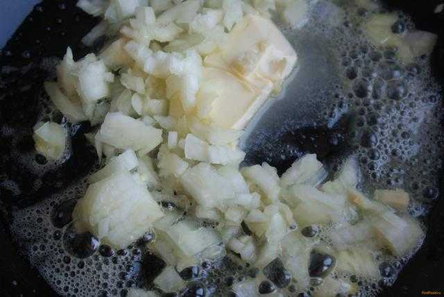 Разогреваем сковороду со сливочным маслом и обжариваем лук до прозрачности.