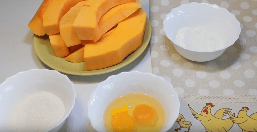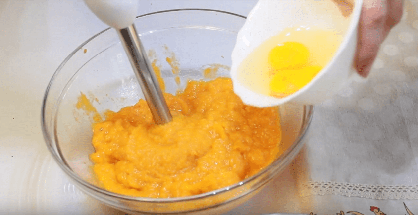 Пока тыква варится, подготовим остальные ингредиенты. Берем три яйца, взбиваем со щепоткой соли.