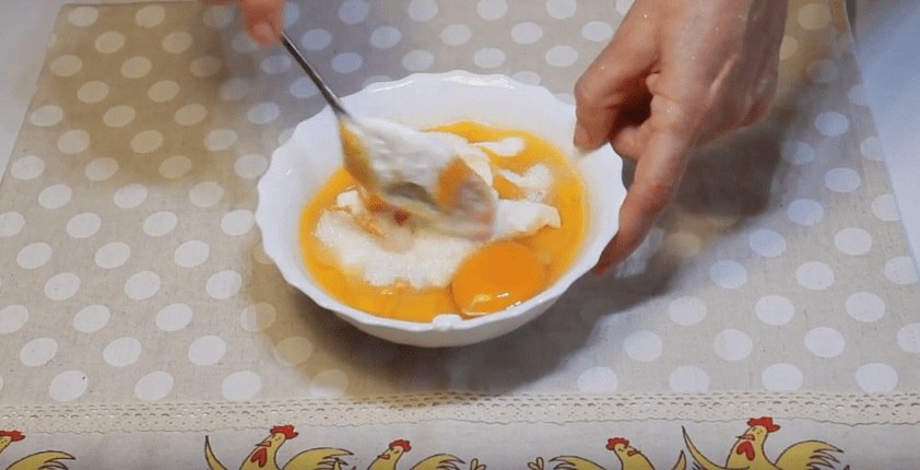 - Кладем в полученную смесь яблоко, желток и насыпаем сахар, теперь все перемешаем.
