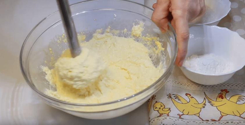 Добавляем творог. Если творог жесткий, то его следует перетереть блендером (можно вместе с яйцом).